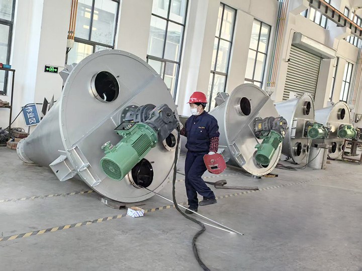 适用范围:单锥双螺旋锥形混合机普遍用于化工、冶金、食品、制药、化肥、涂料、颜料、染料、农药、橡胶饲料、添加剂、耐火材料、精良化工、新材料、电子塑料、陶瓷、矿山、建材等各行业。该混合机对混合物料适应性广,粉料、颗粒状物料、浆料或粘稠体的混合、搅拌、可配备喷液喷淋系统,可按用户要求设计成真空状态、带压状态、加热或冷却等工艺条件,满足不同工艺状况下物料的混合、搅拌。对热敏性物料不会产生过热,对颗粒物料不会压馈和磨碎,对比重悬殊和粒度不同的物料混合不会产生分层离析现象,对粗料、细料和超细粒,纤维或片状的混合也有良好的适应性。