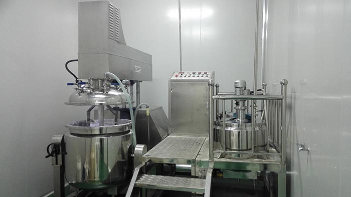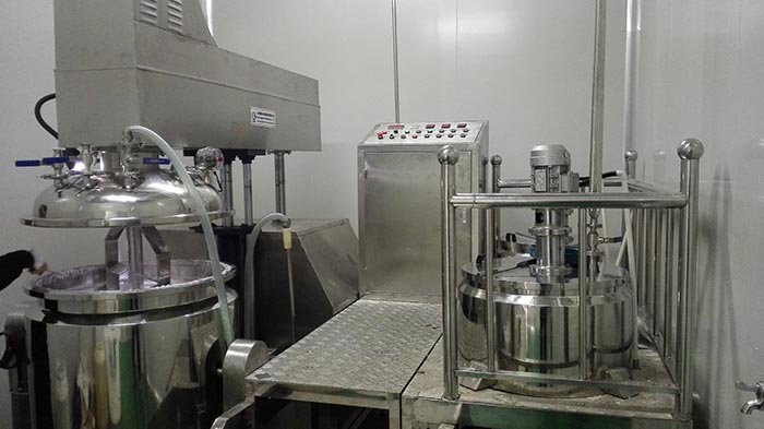 物料在水锅、油锅内通过加热、搅拌进行混合反应后,由真空泵吸入乳化锅,通过乳化锅内上部的中心搅拌、聚四氟乙烯刮板始终迎合搅拌锅形体,扫净挂壁粘料,使被刮取的物料不断产生新界面,再经过叶片的剪断、压缩、折叠,使其搅拌、混合而向下流往锅体下方的均质器处,物料再通过高速旋转的切割轮与固定的切割套之间所产生的强力的剪断、冲击、乱流等过程,物料在剪切缝中被切割,迅速破碎成200um-0.2um的微粒,由于乳化锅内处于真空状态,物料在搅拌过程中产生的气泡被及时抽走。采用抽真空的方式,使所生产的制品在搅拌过程中不再混入气泡,从而保证可制造出富有光泽、细腻及延展性良好的产品。