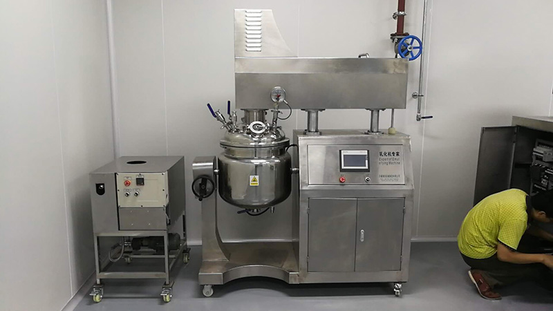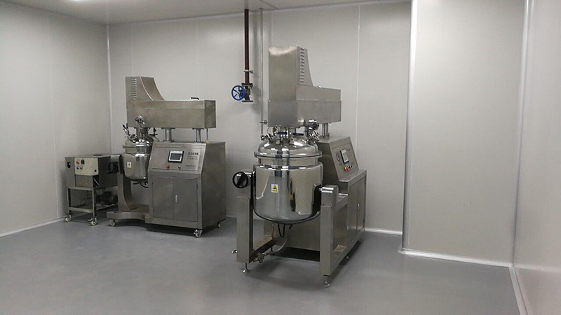 物料在水锅、油锅内通过加热、搅拌进行混合反应后,由真空泵吸入乳化锅,通过乳化锅内上部的中心搅拌、聚四氟乙烯刮板始终迎合搅拌锅形体,扫净挂壁粘料,使被刮取的物料不断产生新界面,再经过叶片的剪断、压缩、折叠,使其搅拌、混合而向下流往锅体下方的均质器处,物料再通过高速旋转的切割轮与固定的切割套之间所产生的强力的剪断、冲击、乱流等过程,物料在剪切缝中被切割,迅速破碎成200um-0.2um的微粒,由于乳化锅内处于真空状态,物料在搅拌过程中产生的气泡被及时抽走。采用抽真空的方式,使所生产的制品在搅拌过程中不再混入气泡,从而保证可制造出富有光泽、细腻及延展性良好的产品。